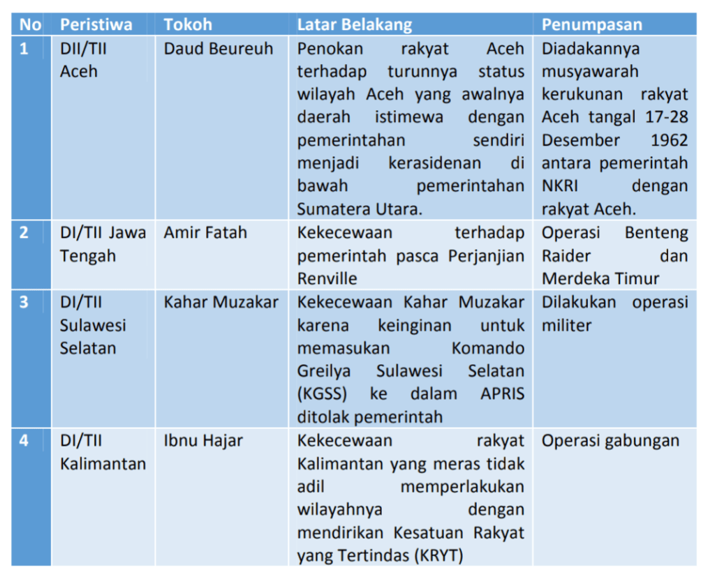 Gerakan DI/TII di berbagai daerah, simaklah tabel materi di bawah ini: